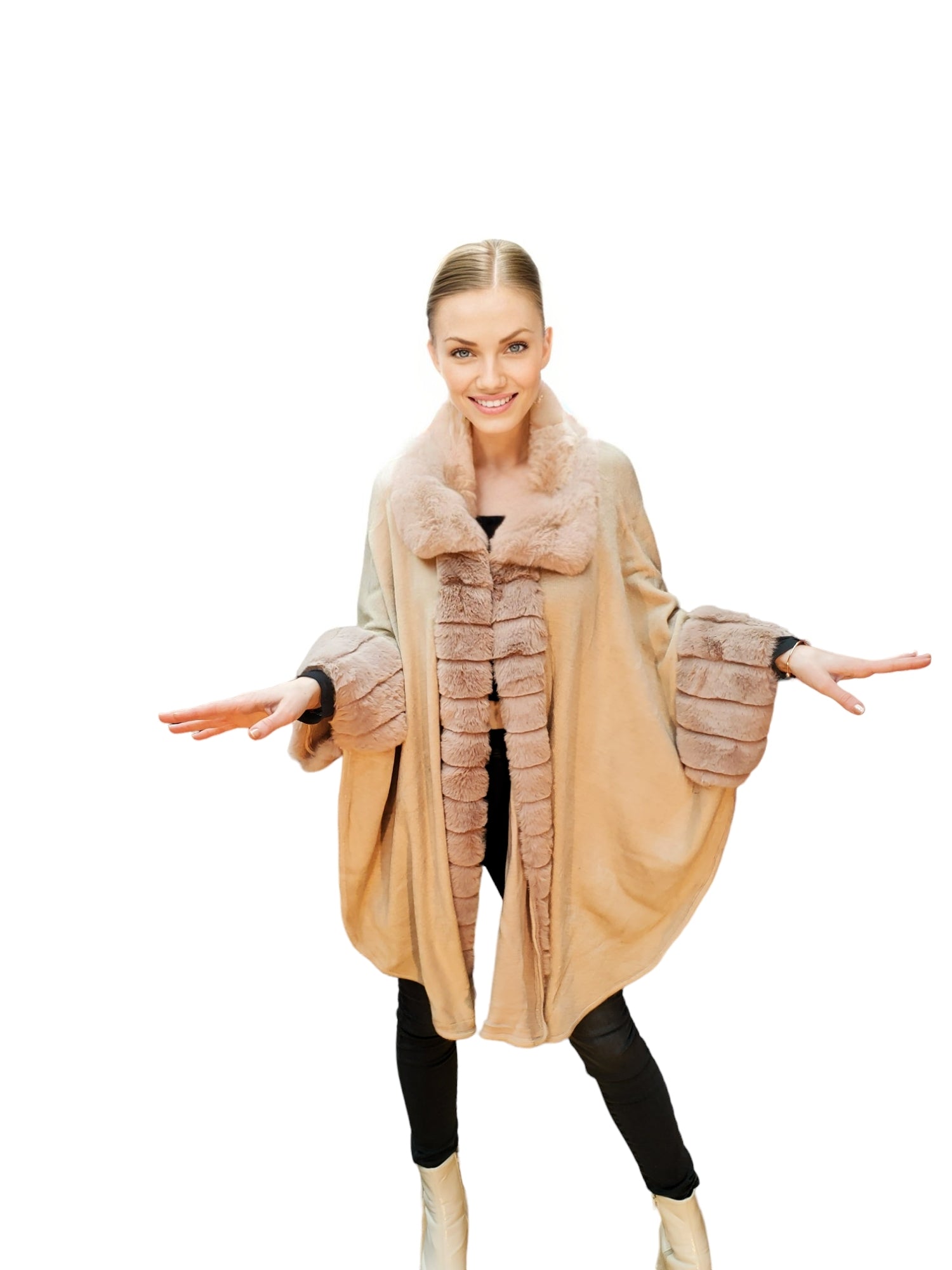 Knitted Cape with Faux Fur Tuxedo Collar & Sleeves