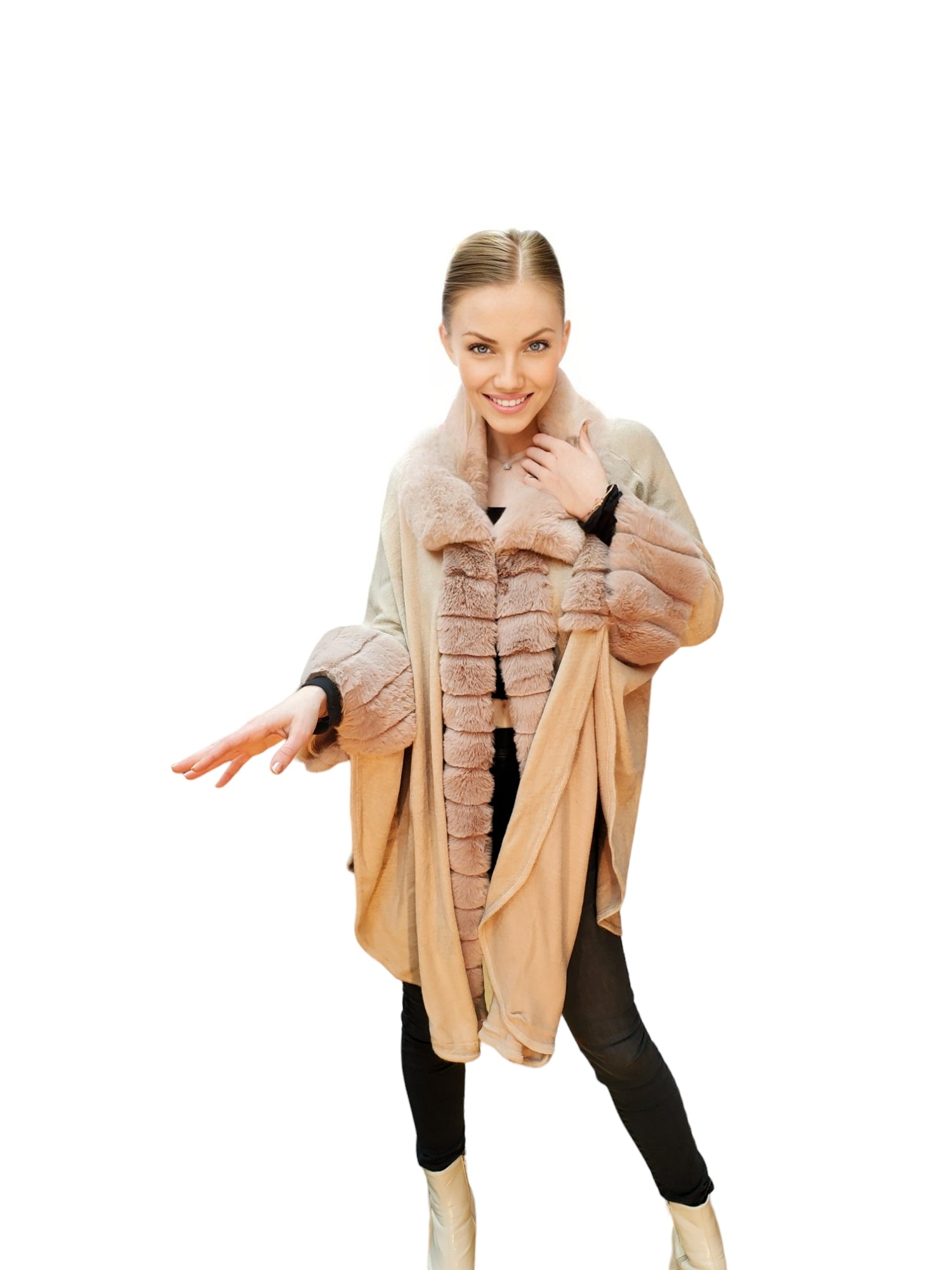 Elegant warmth embraced in a knitted cape with faux fur tuxedo collar and sleeves for ladies.