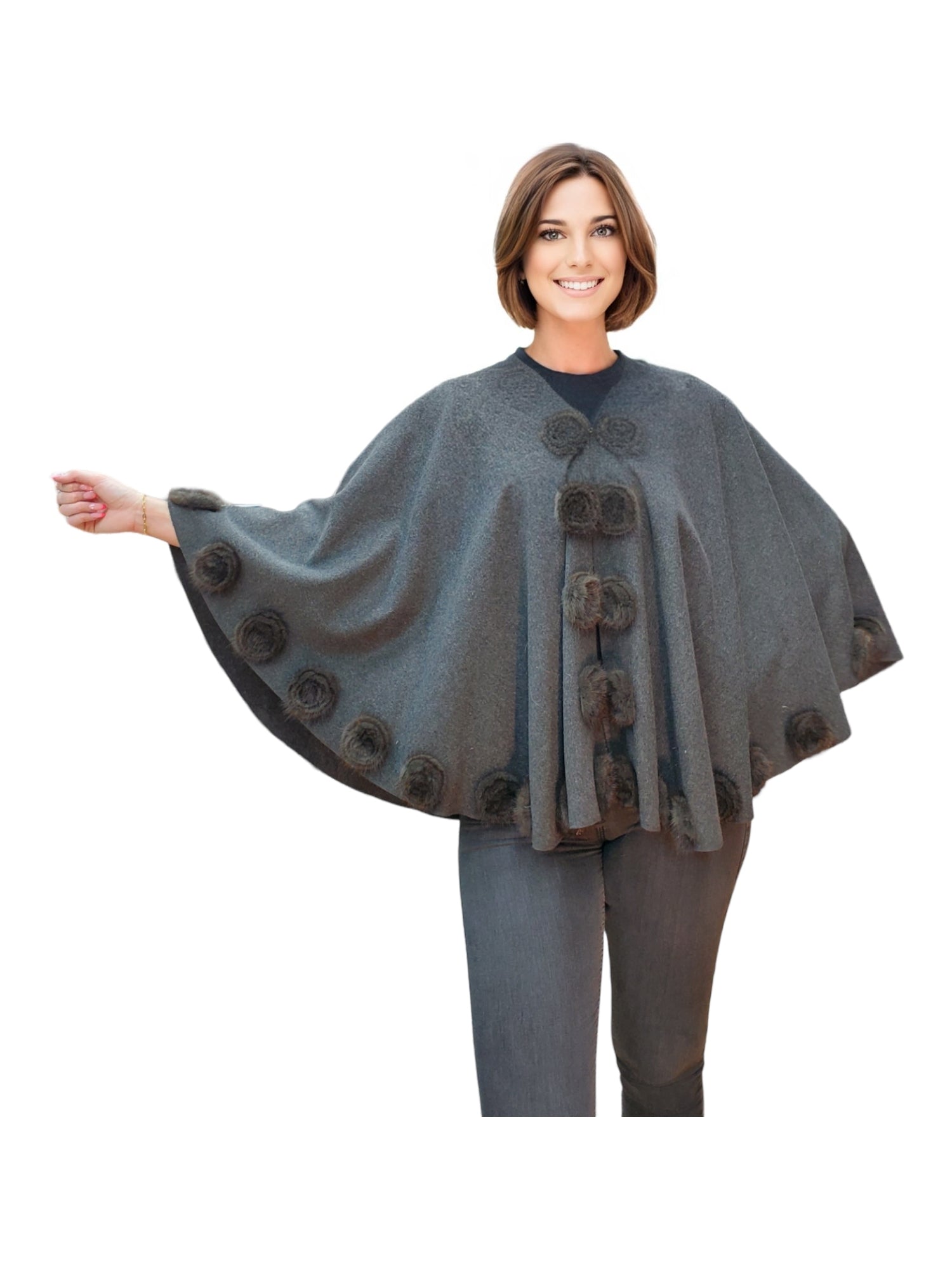 Elevate your style with our luxurious Cashmere Blend Cape adorned with exquisite Mink Rosettes.