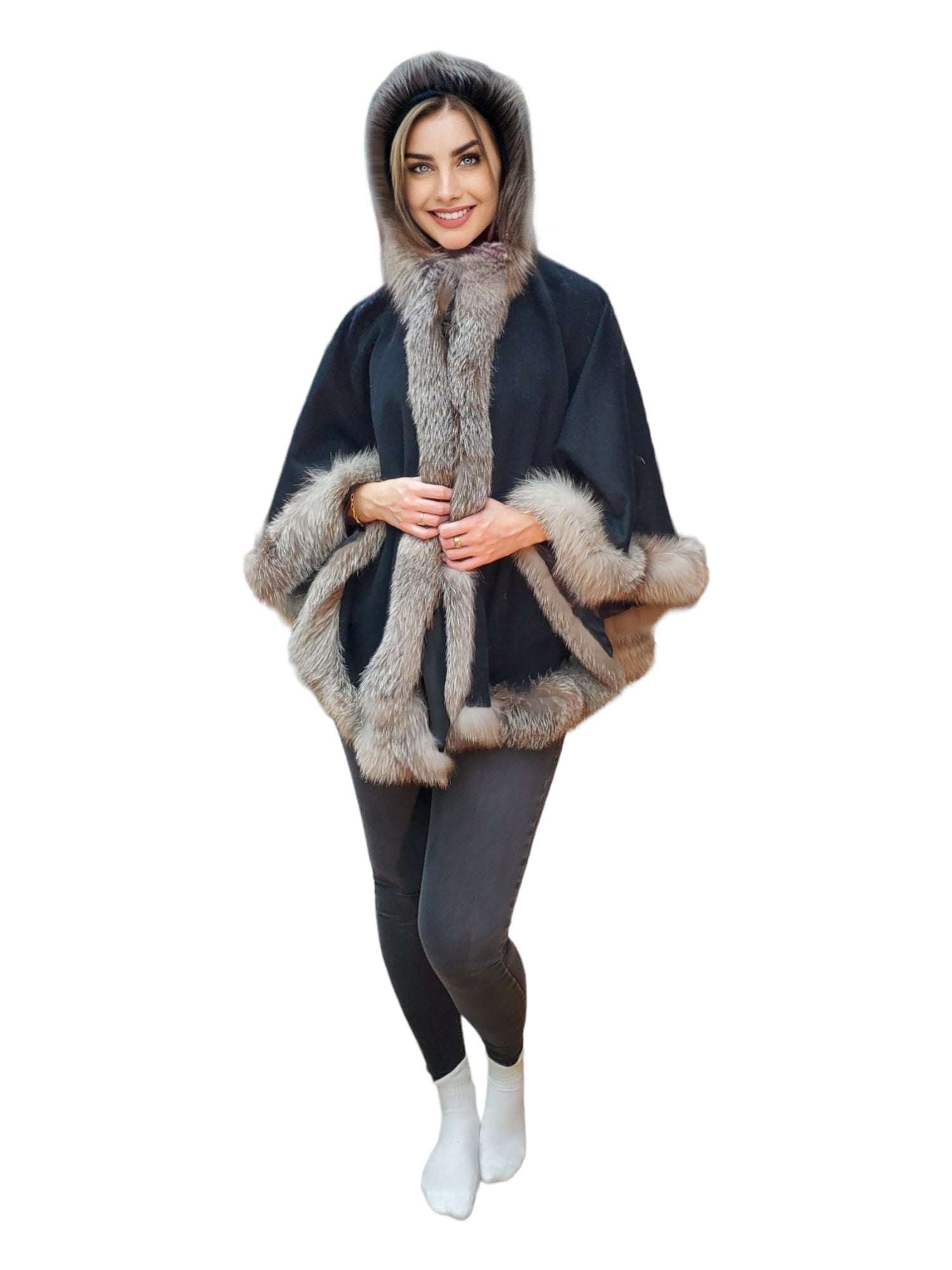Elevate your style with our luxurious Cashmere Blend Cape featuring exquisite Fox Trim for women.