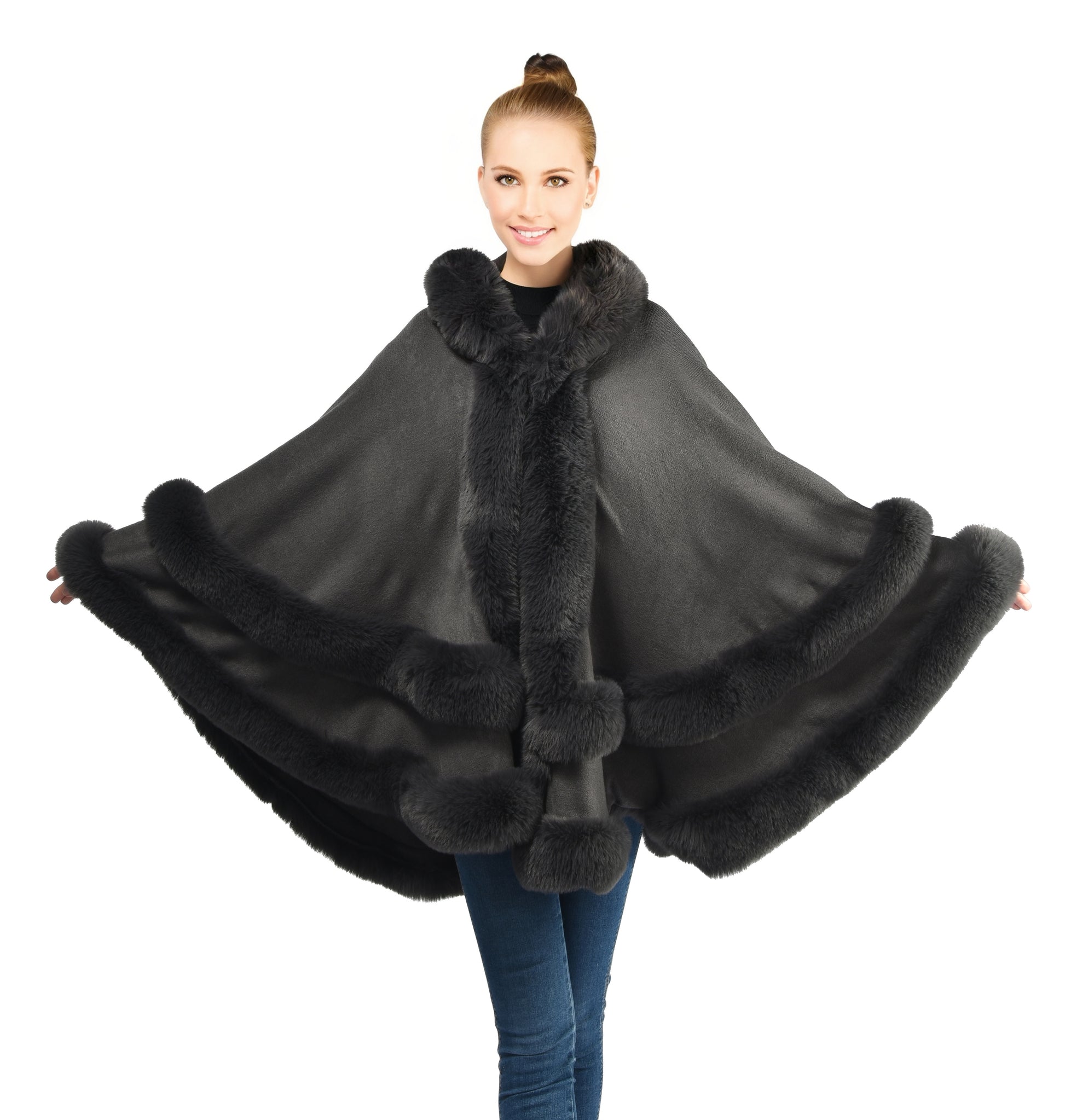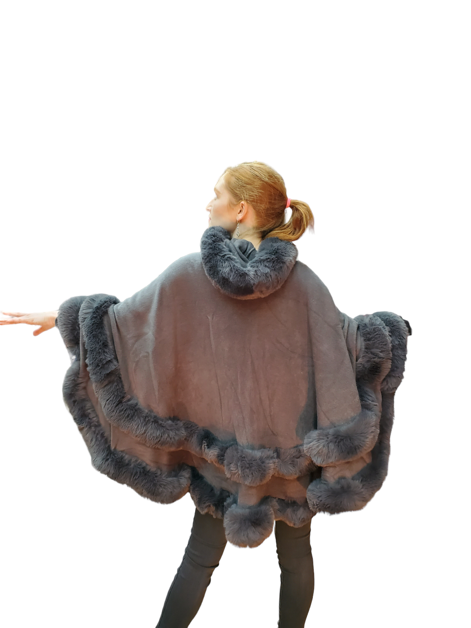 Embrace winter's elegance with our cozy knitted cape, adorned with luxurious faux fur trim.