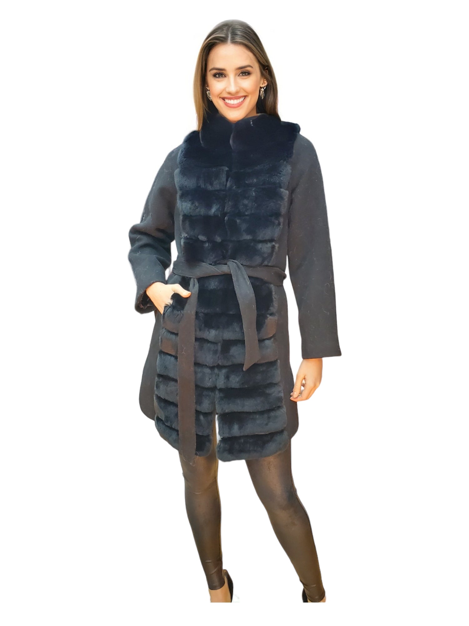 Elevate your style with our Wool Blend Jacket, featuring a luxurious Rex Rabbit Tuxedo Collar.