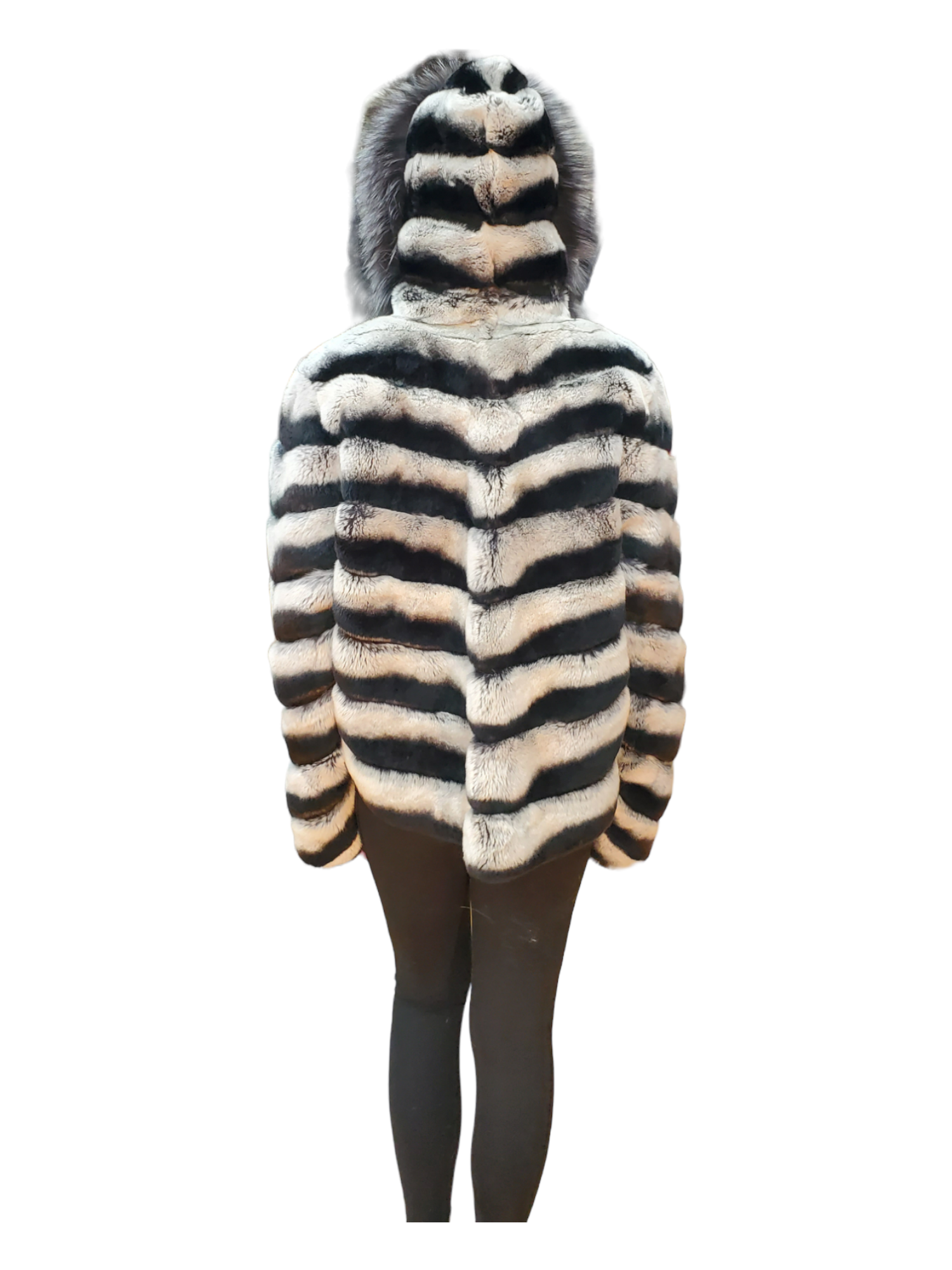 Indulge in luxury with our Sheard Rex Rabbit Jacket, featuring a fox-trimmed hood for fashionable ladies.