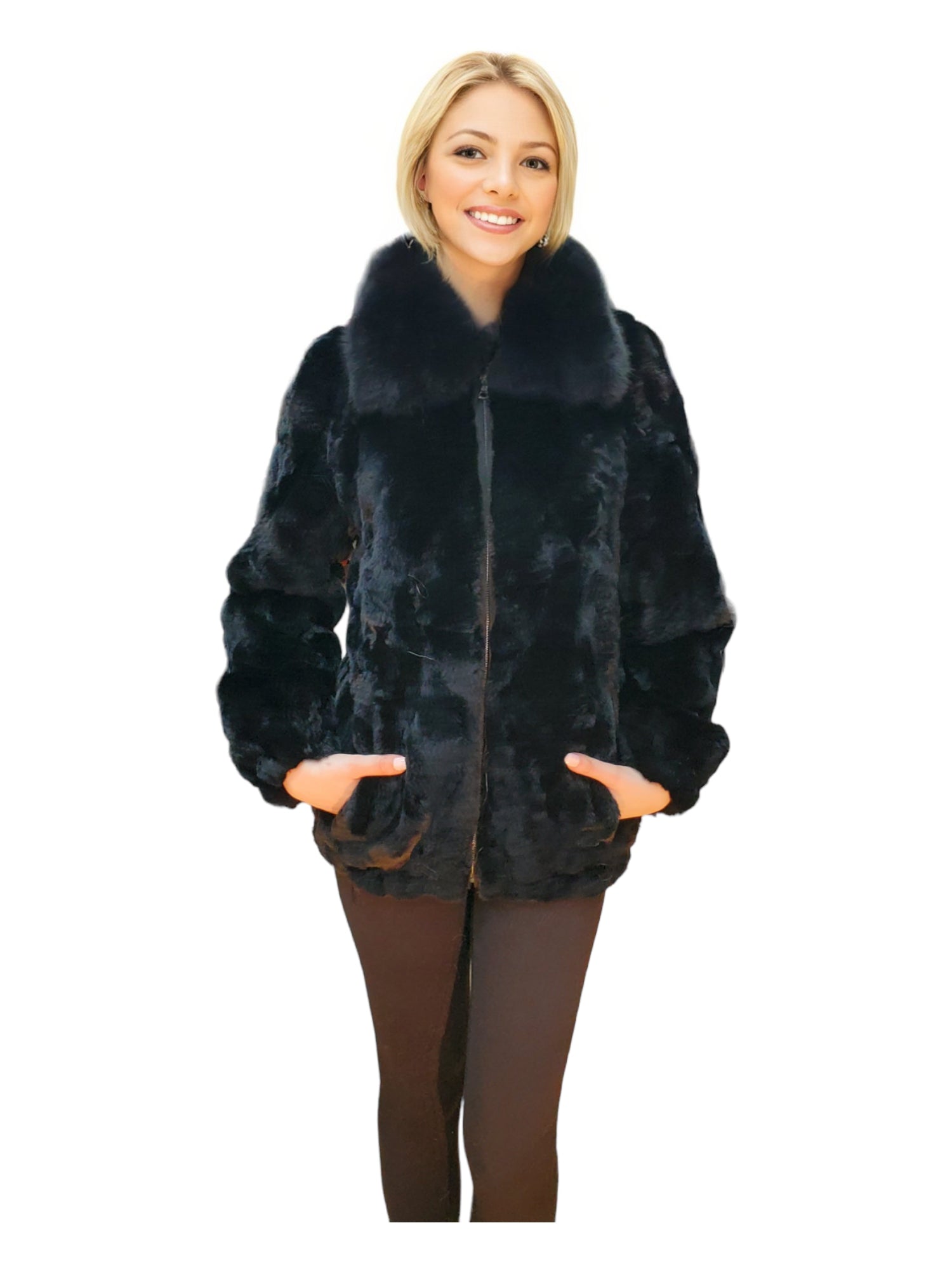Indulge in luxury with our Rex Rabbit Bomber Jacket, featuring a stylish Fox collar for ladies.