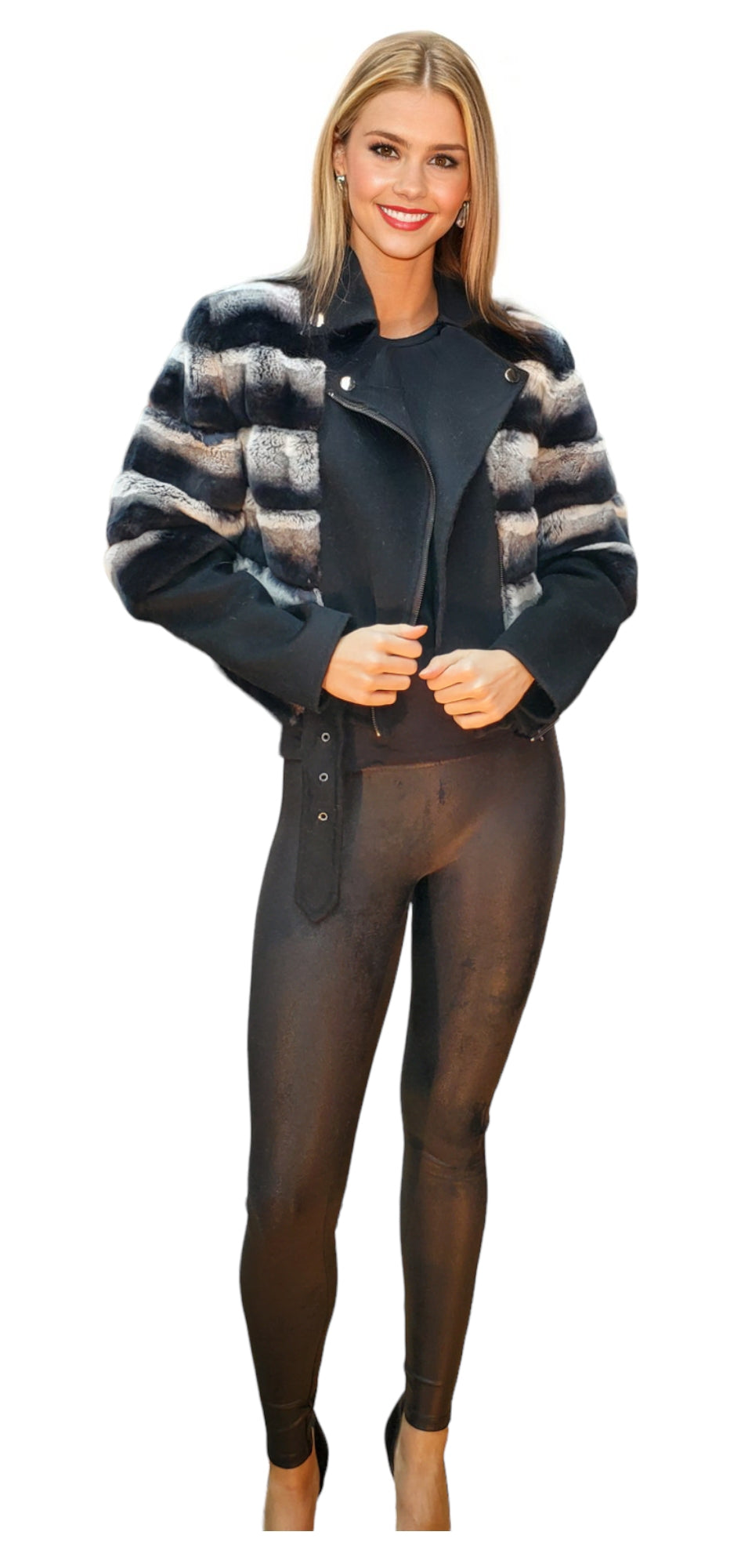 Step into luxury with our Rex Rabbit Jacket, featuring exquisite wool trim for ladies. Feel fabulous and stay warm!