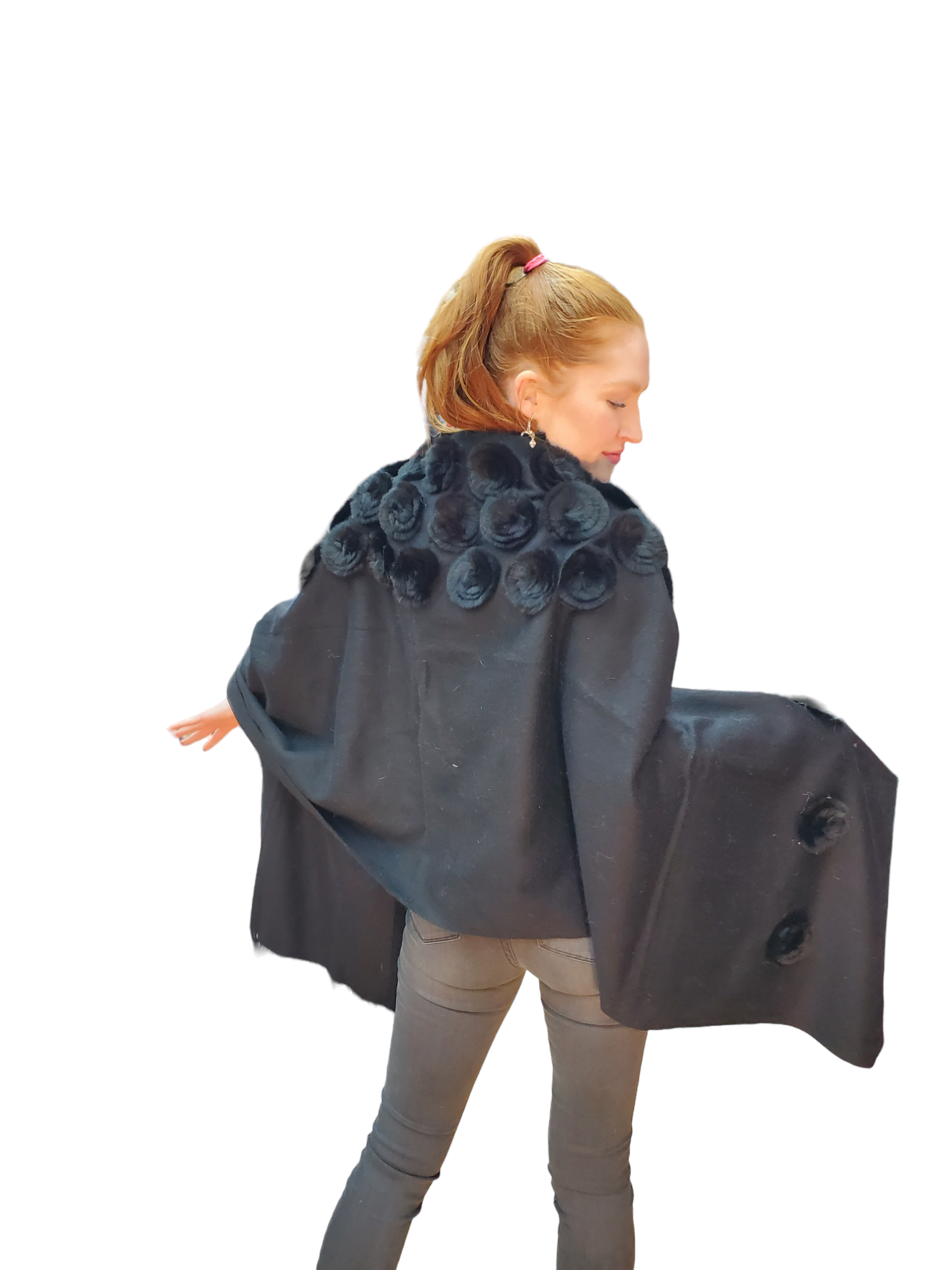 Wool Blend Shawl with Rex Rabbit Rosettes