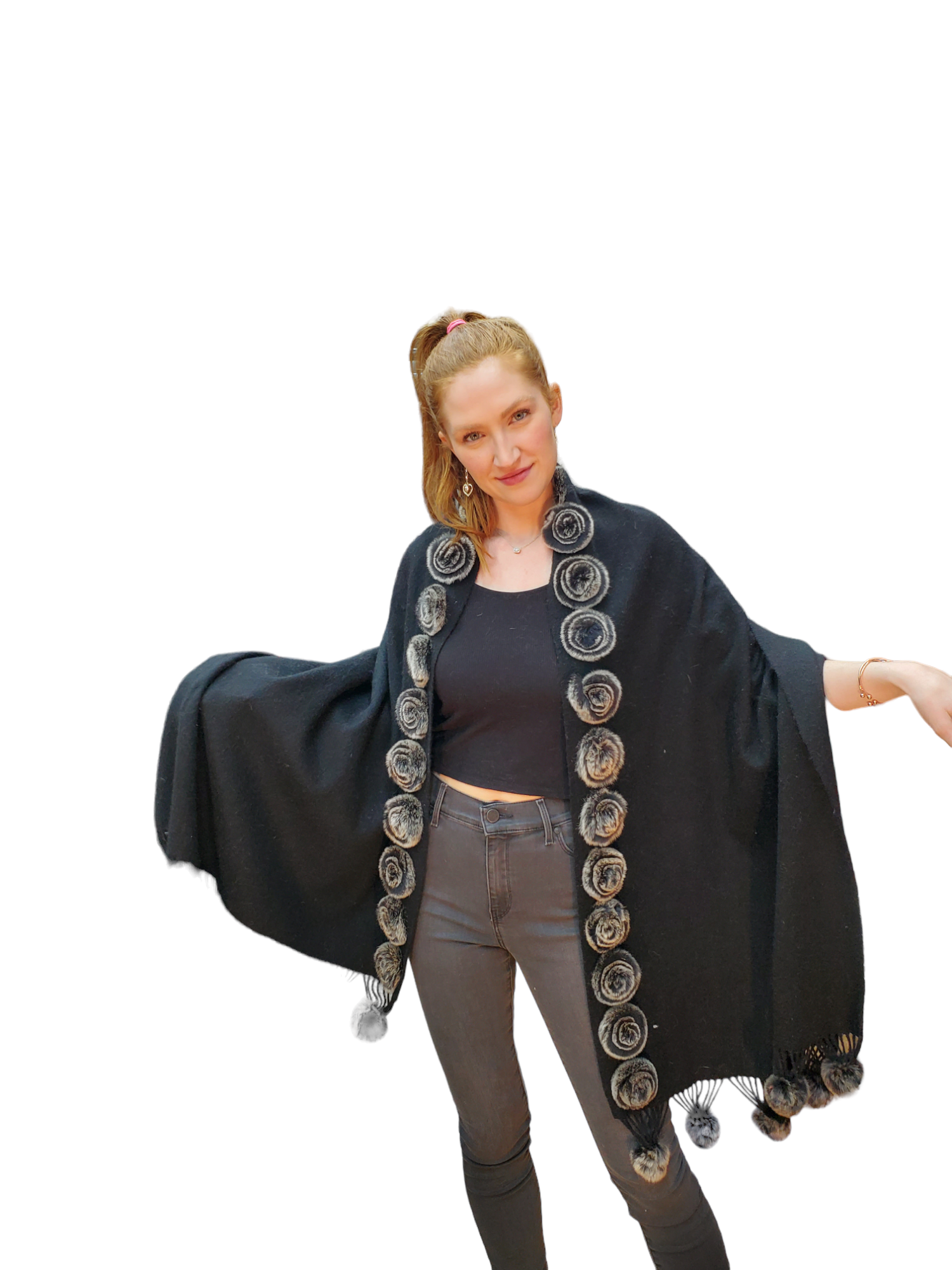 Wool Blend Shawl with Rex Rabbit Rosettes
