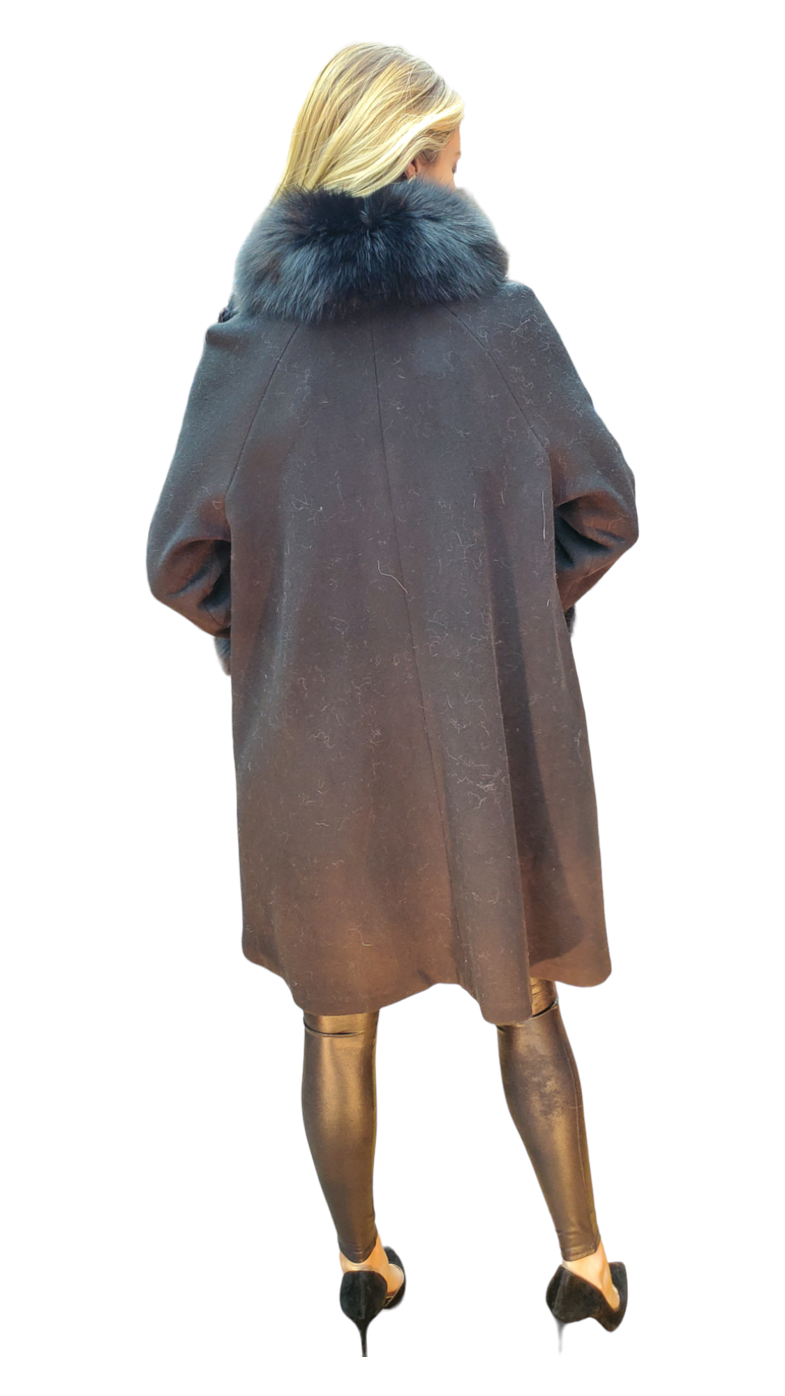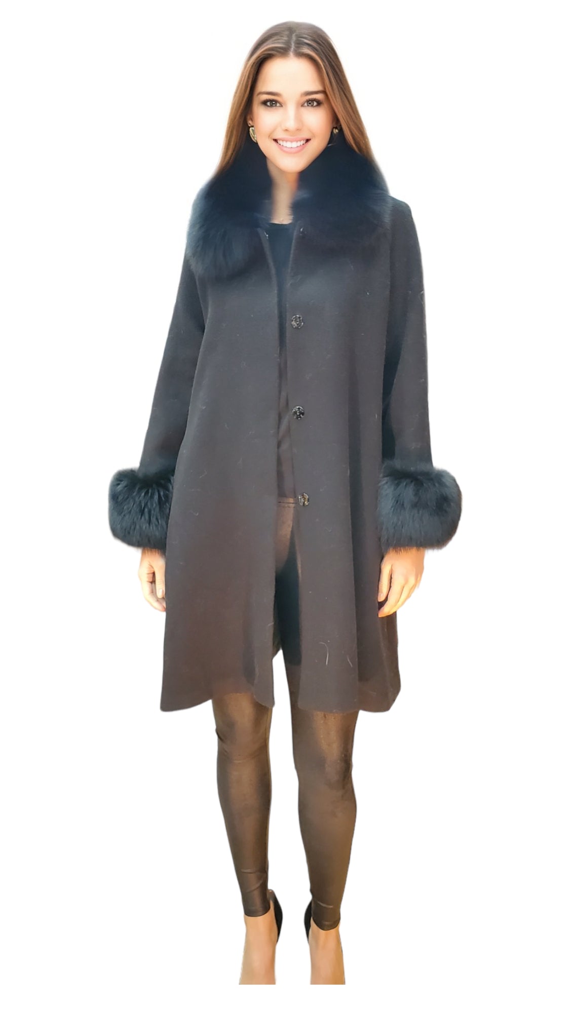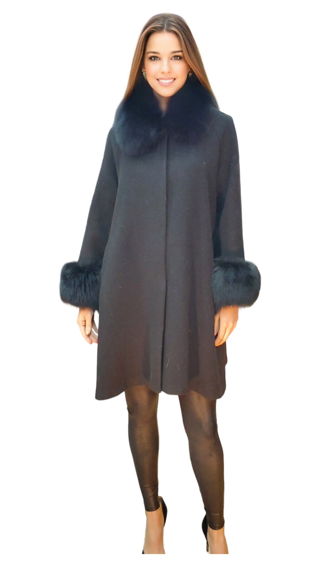 Indulge in elegance. Cashmere blend stroller with fox collar and cuffs, a must-have for ladies.